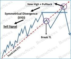 Symmetrical Divergence (SYD): زمانی که یک خطِ روند شکسته میشود و پولبکِ ایجاد شده بروی آن فراتر از اوجِ قبلی تشکیل میشود؛ الگوی واگرایی قرینهای (SYD) ایجاد میشود. بهعنوانمثال در یک روندِ صعودی اگر پس از شکستِ خطِ روندِ صعودی، قیمت سقفِ جدید را دقیقاً در قالبِ پولبک به خطِ روندِ صعودیِ از پیش شکسته شده ایجاد نماید، این الگو بهعنوان الگوی واگرایی قرینهای میتواند یک سیگنالِ فروش، همراه با یک حدِ ضرر فشرده را صادر نماید. در روندهای بســیار تندوُتیز پیش از بازگشتِ روند، اغلب شاهدِ ایجاد دو پولبک به خط روندِ خواهیم بود.