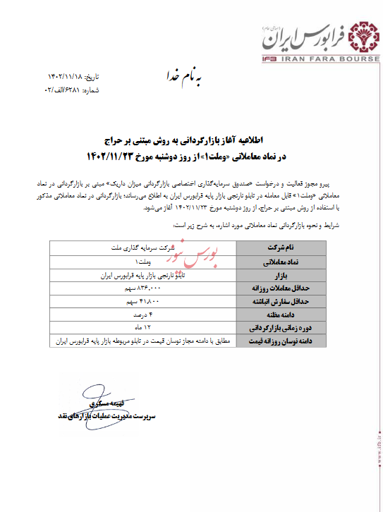 لازم به ذکر است، بازارگردانی نماد مذکو از تاریخ ۱۴۰۲/۱۱/۲۳ صورت می‌گیرد.