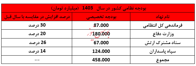 بی تردید بخش بزرگی از هزینههای کشور مربوط به مخارج مرتبط با موارد نظامی میباشد. افزایش در حدود ۲۰.۰۰۰ میلیارد تومانی بودجه نیروی انتظامی، افزایش ۲۸.۰۰۰ میلیارد تومانی بودجه وزارت دفاع، افزایش ۱۴.۰۰۰ میلیارد تومانی بودجه ستاد مشترک ارتش، افزایش ۱۵.۰۰۰ میلیارد تومانی بودجه ستاد مشترک سپاه پاسداران تنها قسمتی از افزایش در حدود ۷۷.۰۰۰ میلیارد تومانی بودجه نظامی کشور در سال ۱۴۰۳ میباشد.