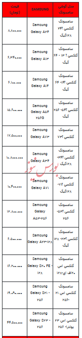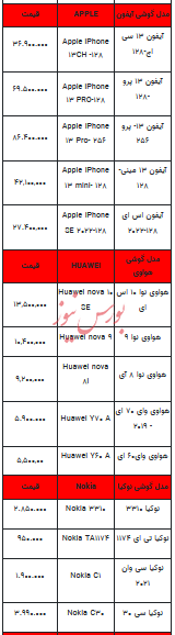 بر اساس این گزارش، آخرین قیمت موبایل و تلفن همراه در روز جاری به شرح زیر است: