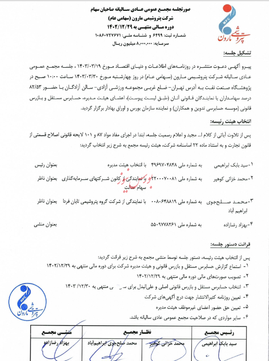 شرکت پتروشیمی مارون از افشای تصمیمات مجمع عمومی عادی سالیانه در ۳۰ خرداد خبر داد.