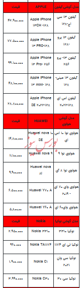 بر اساس این گزارش، آخرین قیمت موبایل و تلفن همراه در روز جاری به شرح زیر است:
