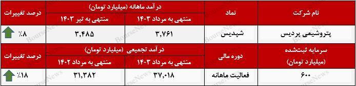 این درآمد از فروش بیش از ۳۰۱ هزار تن از محصولات شرکت به دست آمده است که بخش عمده آن از فروش صادراتی "شپدیس" حاصل شده است. فروش صادراتی شرکت پتروشیمی پردیس در مقایسه با تیرماه سال جاری رشدی ۵ درصدی را تجربه کرده است.