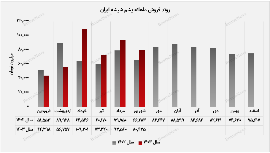 مقدار فروش ماهانه شرکت پشم شیشه ایران در ششمین ماه از سال جاری یک هزار و ۴۰ تن و ۲۳۹ هزار مترمربع ایزوگام نیز به فروش رساند. مقدار فروش "کپشیر" در شهریورماه نسبت به مردادماه ۱۳ درصد کاهش پیدا کرد.