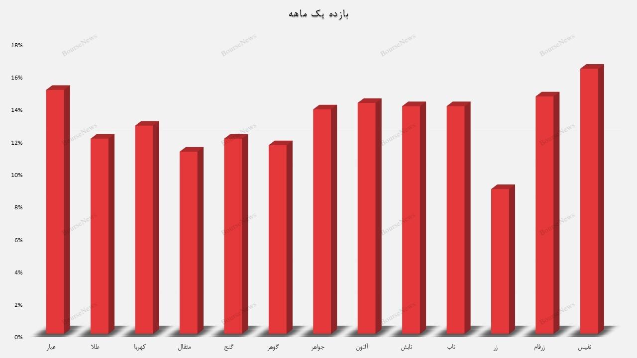 صندوق عیار ۱۵ درصد، طلای لوتوس ۱۲ درصد، کهربا ۱۲.۸ درصد، مثقال ۱۱.۲ درصد، گنج ۱۲ درصد، گوهر ۱۱.۶ درصد، جواهر ۱۳.۸ درصد، آلتون ۱۴.۲ درصد، تابش و ناب ۱۴ درصد، زر ۸.۹ درصد، زرفام ۱۴.۶ درصد و نفیس ۱۶.۳ درصد بازدهی ماهانه داشتند. صندوق نفیس و سپس عیار، بهترین عملکرد ماهانه را از خود نشان دادند که با رشد نرخ دلار همبستگی بالایی داشته اند. صندوق‌های مثقال و بخصوص زرافشان امید ایرانیان طبق معمول کمترین بازدهی را داشته و به ترتیب، ۱۱.۶ و ۸.۹ درصد رشد قیمت را تجربه کرده اند.