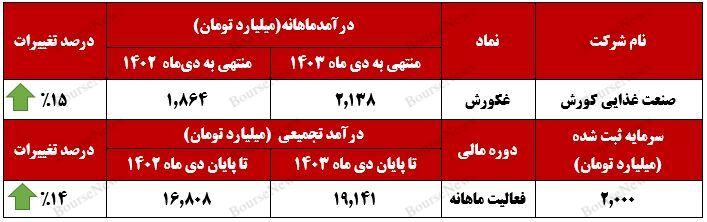 شرکت "غکورش" با ثبت رشد ۲۷۴ میلیارد تومانی درآمد خود در دیماه، روند صعودی خود را از سر گرفت و موفق شد نسبت به آذرماه ۱۵ درصد و در مقایسه با دوره مشابه سال گذشته ۱۱ درصد رشد درآمدی داشته باشد. همچنین، درآمد تجمیعی این شرکت در دوره ۱۰ ماهه منتهی به دیماه، به رقم ۱۹.۴ هزار میلیارد تومان (همت) رسید که نشاندهنده رشد ۱۴ درصدی نسبت به دوره مشابه سال گذشته است.