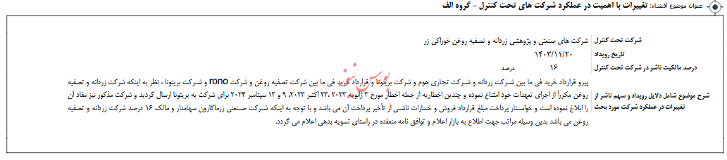 بر اساس این گزارش، این شرکت اعلام کرد، پیرو قرارداد خرید فی ما بین شرکت زردانه و شرکت تجاری هوم و شرکت بریتونا و قرارداد خرید فی ما بین شرکت تصفیه روغن و شرکت rono و شرکت بریتونا، نظر به اینکه شرکت زردانه و تصفیه روغن مکرراَ از اجرای تعهدات خود امتناع نموده و چندین اخطاریه برای شرکت به بریتونا ارسال شد و شرکت مذکور نیز مفاد آن را ابلاغ نموده و خواستار پرداخت مبلغ قرارداد فروش و خسارات ناشی از تأخیر پرداخت آن است.