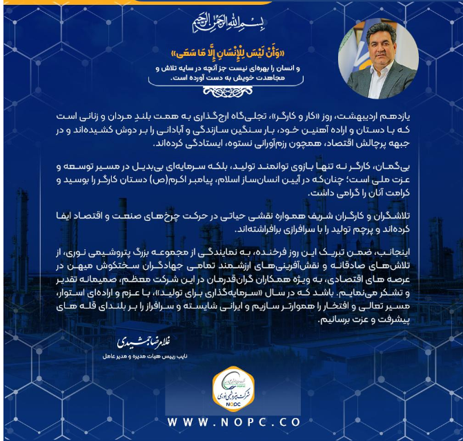 پیام مدیرعامل پتروشیمی نوری به مناسبت گرامیداشت روز جهانی کار و کارگر