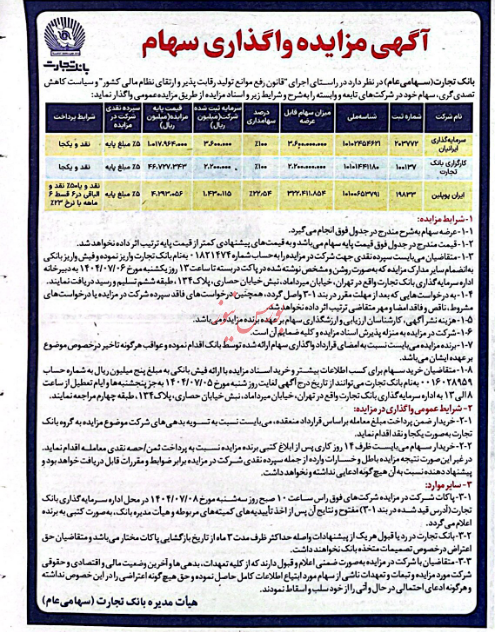 بانک تجارت از برگزاری مزایده فروش سهام خبر داد.