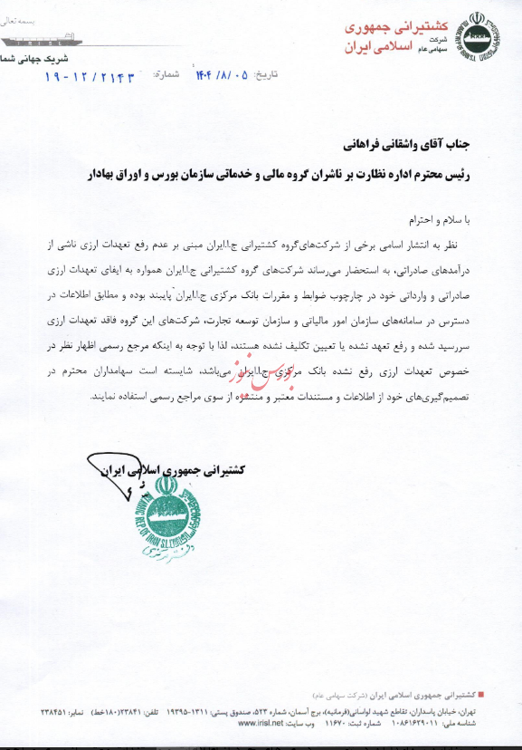 شرکت کشتیرانی جمهوری اسلامی ایران درخصوص رفع تعهدات ارزی ناشی از درآمدهای صادراتی توضیح داد.