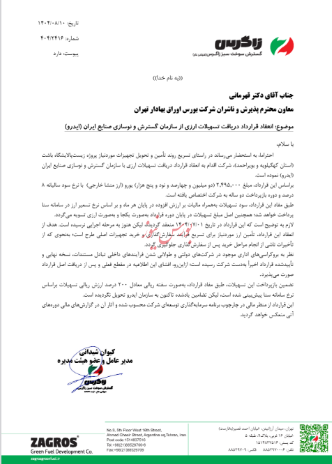 شرکت گسترش سوخت سبز زاگرس از انعقاد قرارداد دریافت تسهیلات ارزی از سازمان گسترش خبر داد.