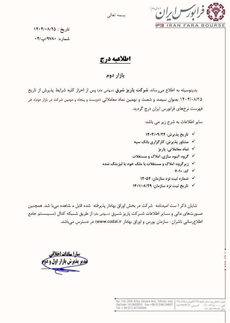 بر اساس این گزارش، شرکت پاریز شرق به عنوان نخستین شرکت ساختمانی بخش خصوصی و سیصد و شصت و نهمین نماد معاملاتی (دویست و پنجاه و دومین شرکت در بازار دوم)، در فهرست نرخ‌های فرابورس ایران درج شد.