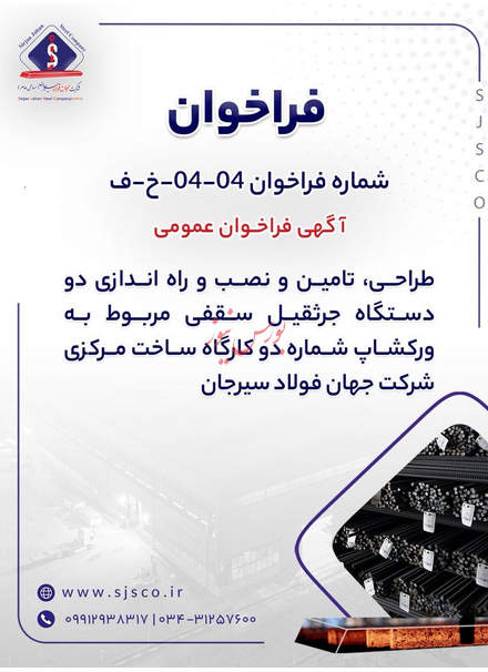بر اساس این گزارش، این شرکت اعلام کرد، شرکت جهان فولاد سیرجان در نظر دارد "طراحی، تامین و نصب و راهاندازی دو دستگاه جرثقیل سقفی مربوط به ورکشاپ شماره دو کارگاه ساخت مرکزی" را به شرکتهای سازنده واگذار نماید؛ لذا از سازندگان واجد صلاحیت دعوت به عمل میآید حداکثر تا پایان وقت اداری روز چهارشنبه مورخ ۱۴۰۴/۱۰/۱۷، نامه اعلام آمادگی خود را به همراه مدارک و مستندات بر اساس دستورالعمل ارزیابی کیفی به آدرس ایمیل tender@sjsco.ir ارسال نمایند.
