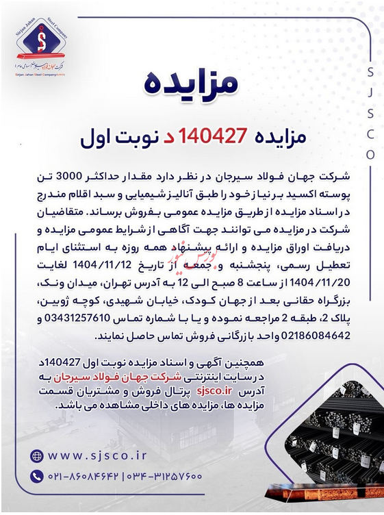 شرکت جهان فولاد سیرجان از برگزاری مزایده خبر داد.