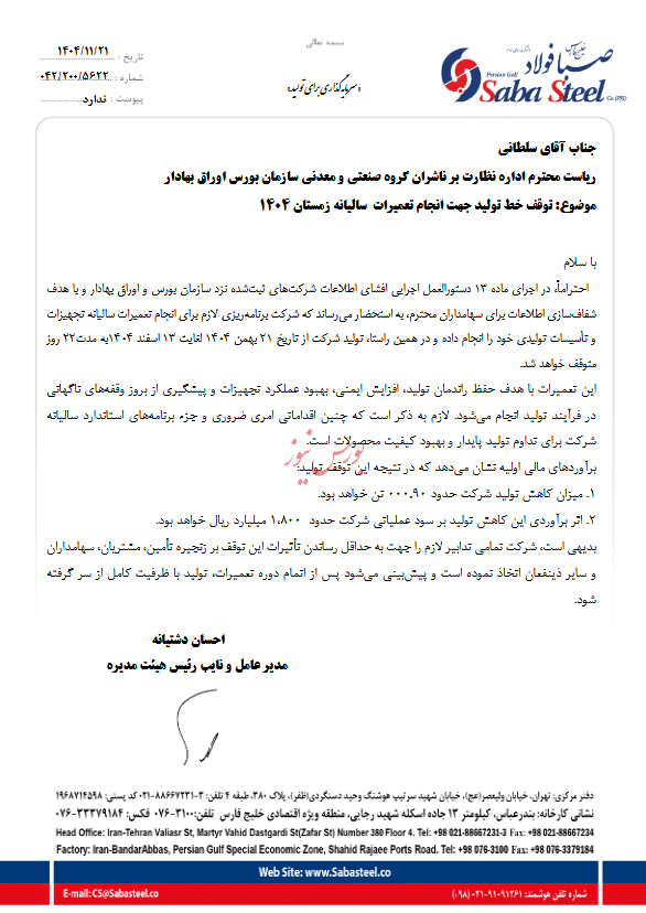 به گزارش بورس نیوز، شرکت صبا فولاد خلیج فارس از توقف بخشی از فعالیت‌های شرکت خبر داد.